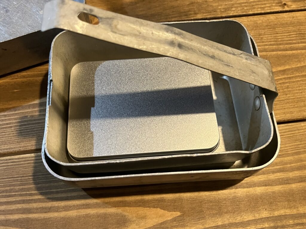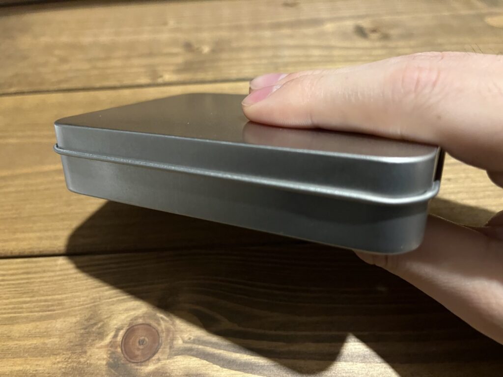缶ケースサイズは8.5×11.5㎝で厚さは2.5㎝なので手のひらサイズで薄く、バッグパックの小さなポケットやクッカーにスタッキングすることも容易です。