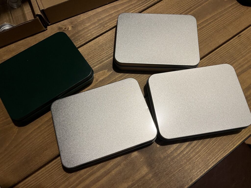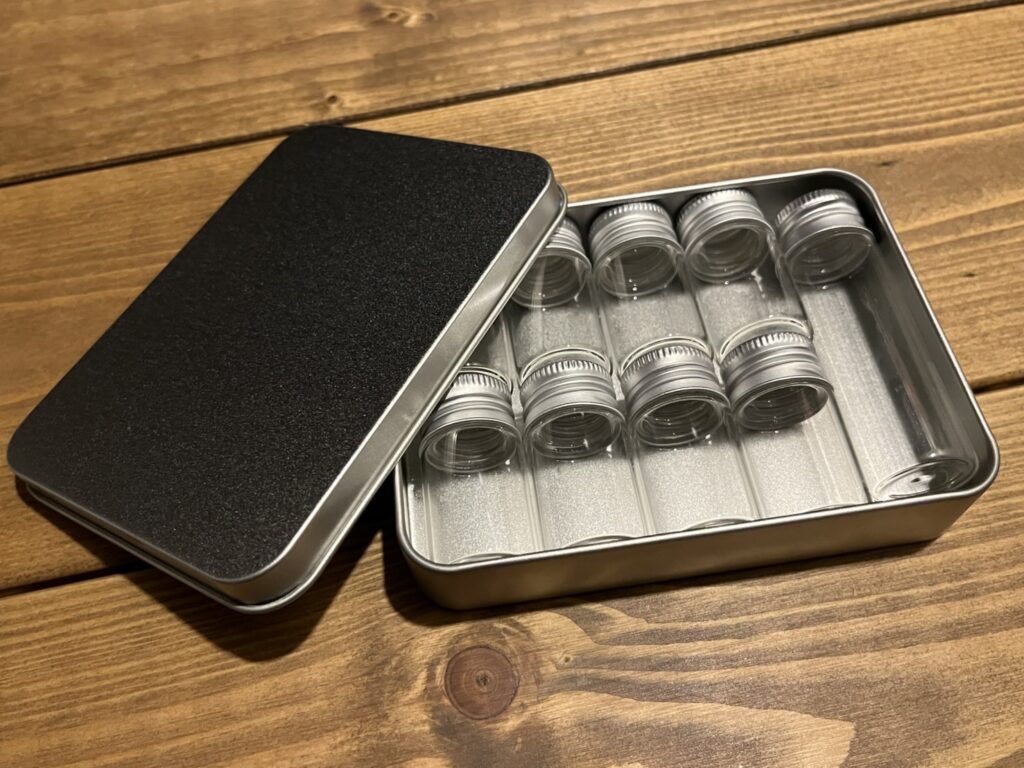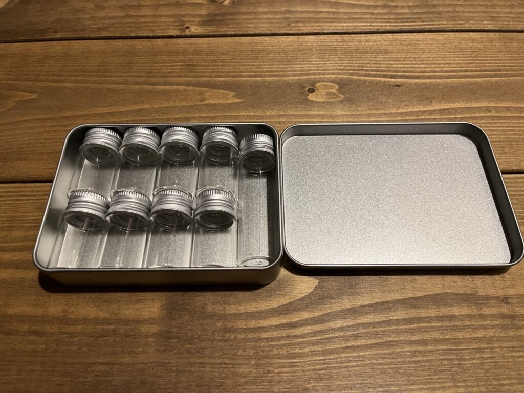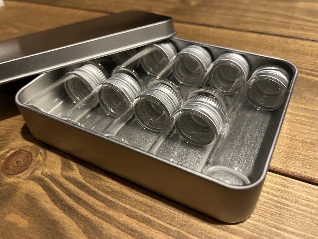 缶ケースに入る小瓶は8mlなら最大8本。15mlの小瓶は5本入ります。